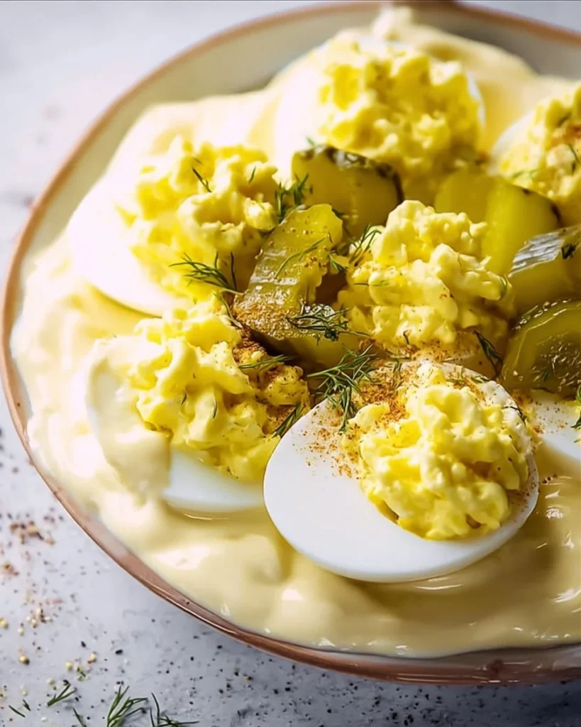 For a twist, try different types of pickles or add herbs and spices to suit your taste. Ensure egg halves are stable to avoid mess while serving. Refrigerate leftovers in an airtight container for up to 2 days.
