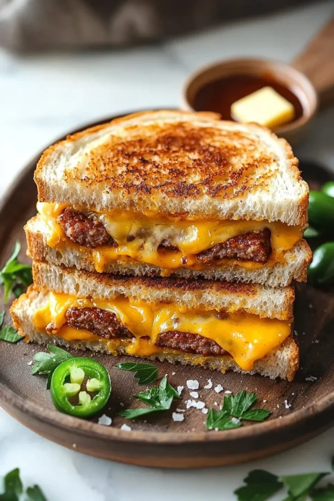 - On the unbuttered side of one slice, layer your choice of cheese followed by the slices of spicy beef sausage. Add optional toppings if desired.