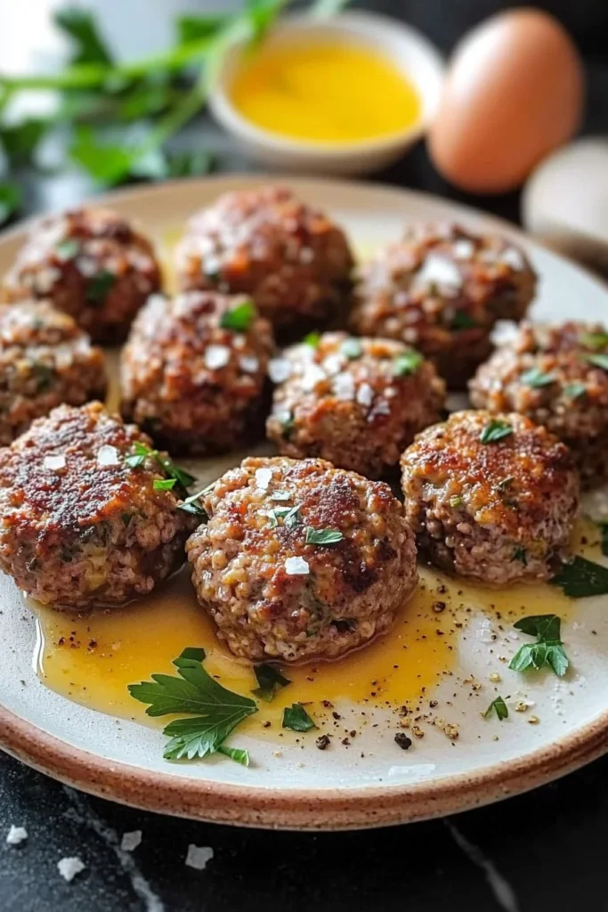 - In a large mixing bowl, combine the ground beef, breadcrumbs, Parmesan cheese, chopped parsley, egg, minced garlic, salt, black pepper, onion powder, and Italian seasoning.